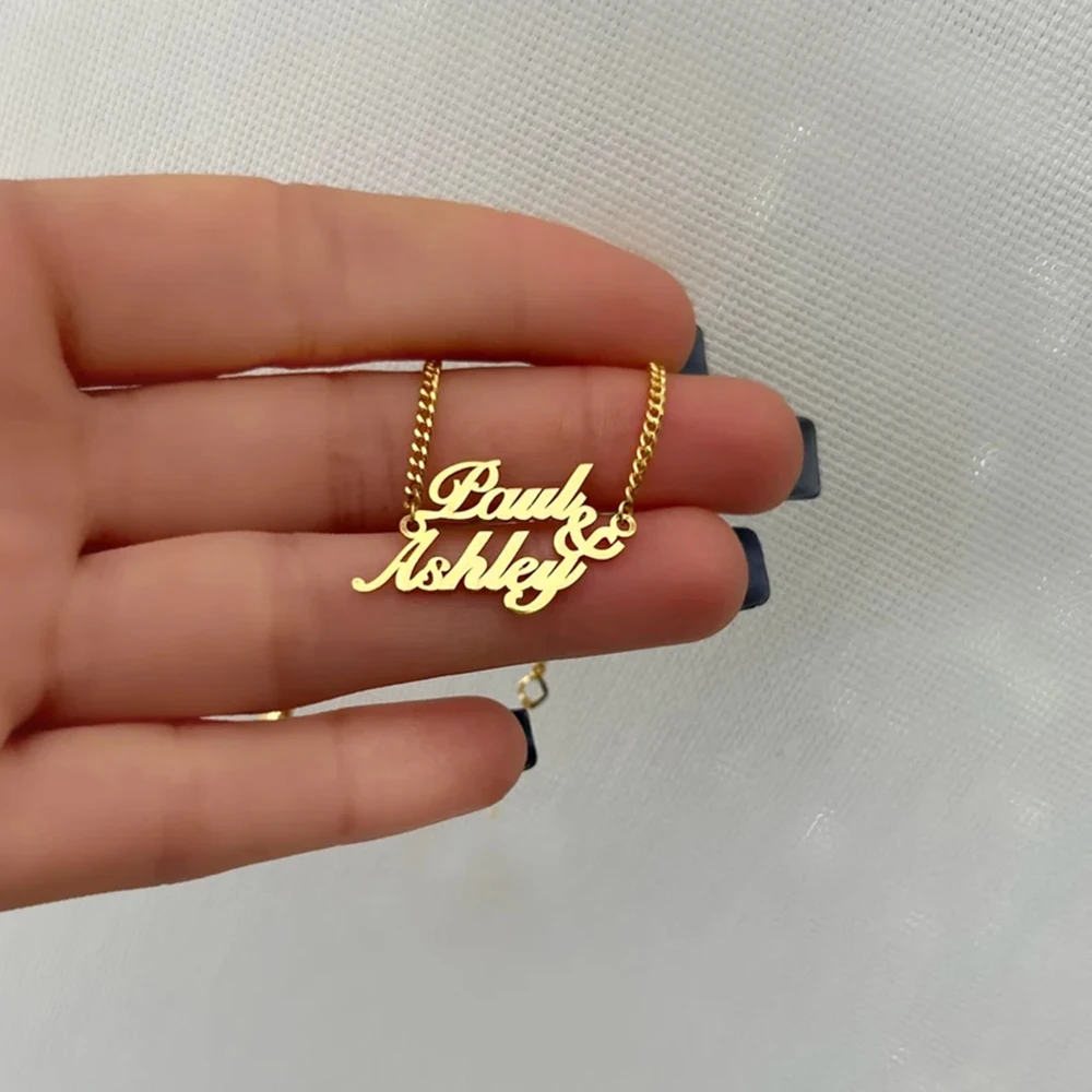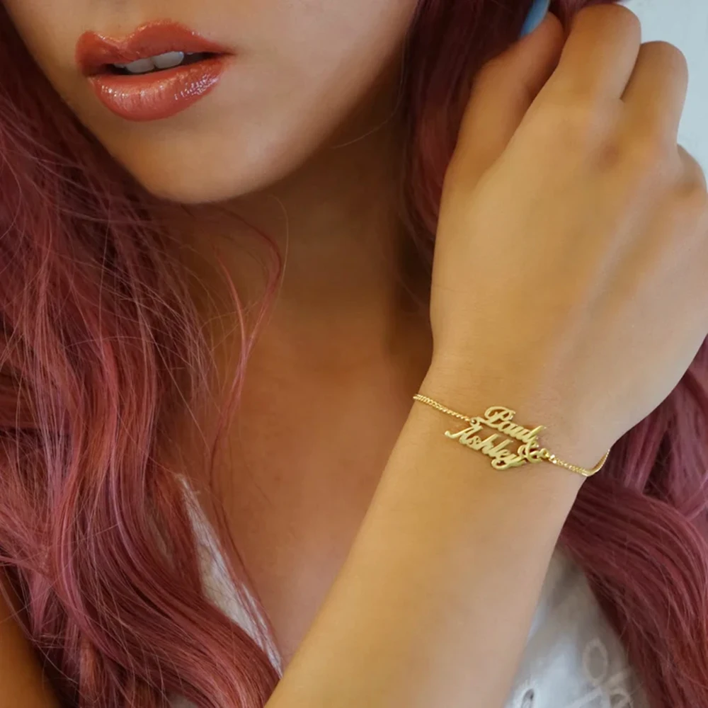 This elegant double name bracelet features custom charms in durable gold stainless steel, creating a meaningful accessory for everyday wear. Perfect as a heartfelt gift, this personalized bracelet celebrates connections with style and sophistication, making it an ideal choice for any special occasion. A unique piece that blends beauty and sentiment effortlessly.